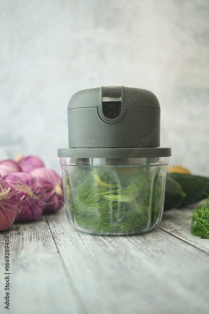 Chopping herbs and vegetables in a kitchen workspace
