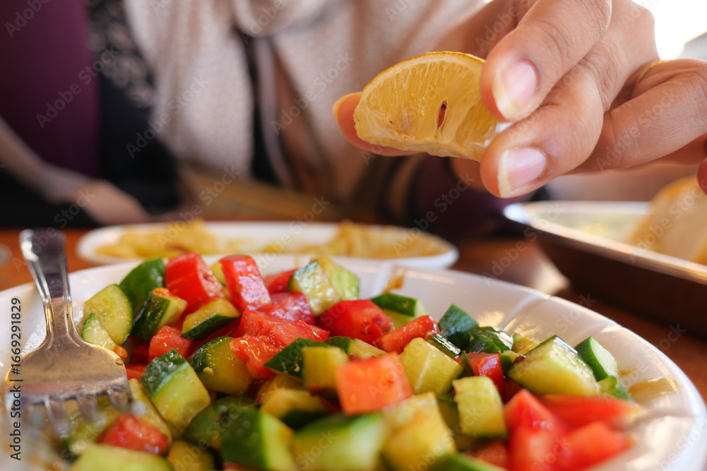 A hand squeezes lemon onto a vibrant salad of fresh vegetables