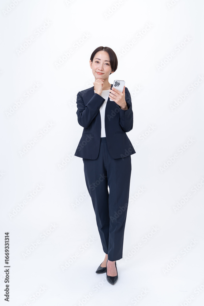 携帯を持ち考える女性