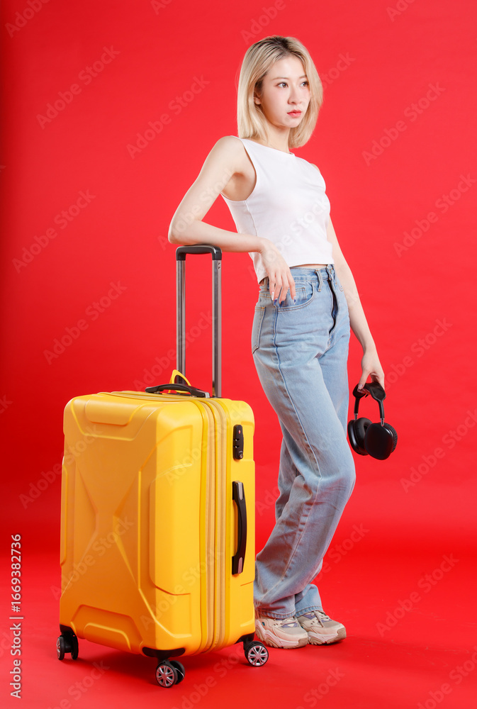 Asian young beautiful confident tourist woman, blonde short hair wearing white sleeveless light blue jeans, standing with yellow trolley travel luggage holding headset on red background trip journey.