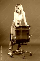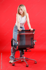 Asian fashion portrait young beautiful cheerful woman blonde short hair wearing white sleeveless light blue jeans, Gen Z confidently standing posing with office chair on red background look at camera