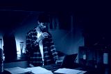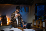 Adult man working late night at home, drinking coffee while using a laptop in the kitchen