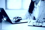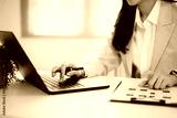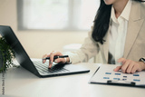 Close up of businesswoman working on laptop and analyzing documents with financial data.