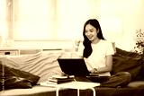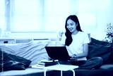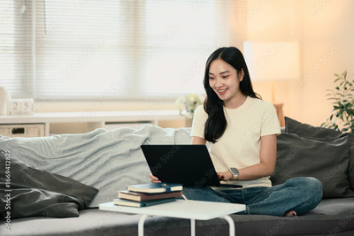 Casual woman working remotely on laptop, enjoying online class or virtual meeting