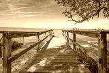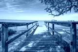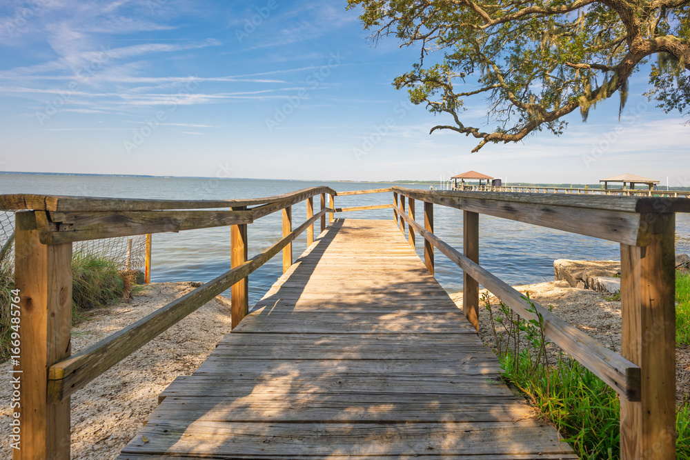 Peaceful wooden walkway leads to serene waters and blue skies at a tranquil coastal location
