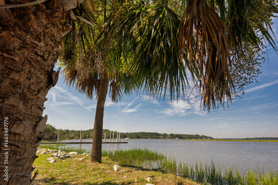Tranquil waterfront view with palm trees and serene waters during midday in a tranquil natural setting