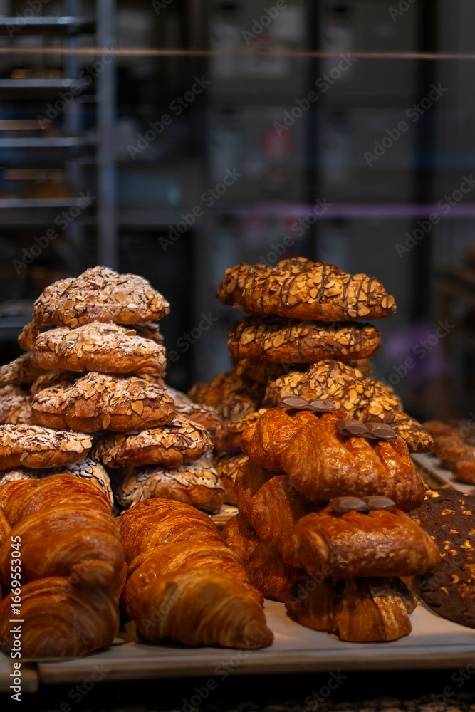 Delicious assortment of freshly baked pastries displayed at a bakery