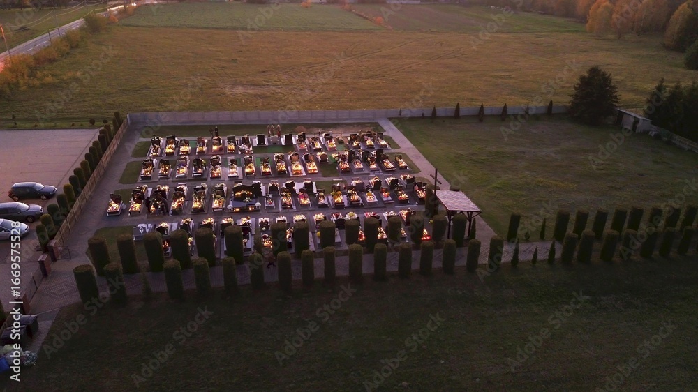 Aerial night view of cemetery honoring Polish All Saints Day tradition