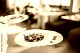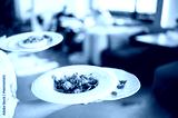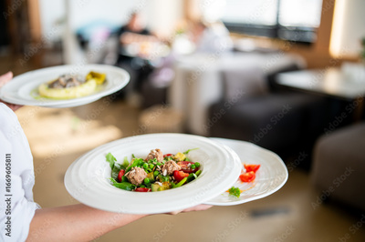 Waiter serving three plated meals in a restaurant. Colorful salad, mushroom dish, and garnish presented on white plates. Blurred dining area in background. Food service and presentation.