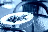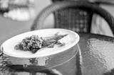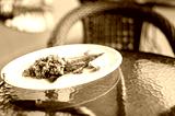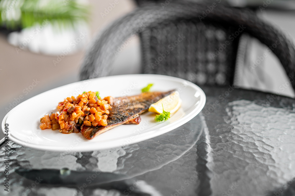 Grilled fish fillet with tomato salsa, lemon wedges, and parsley garnish served on a white plate outdoors. Elegant restaurant-style food presentation