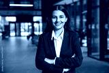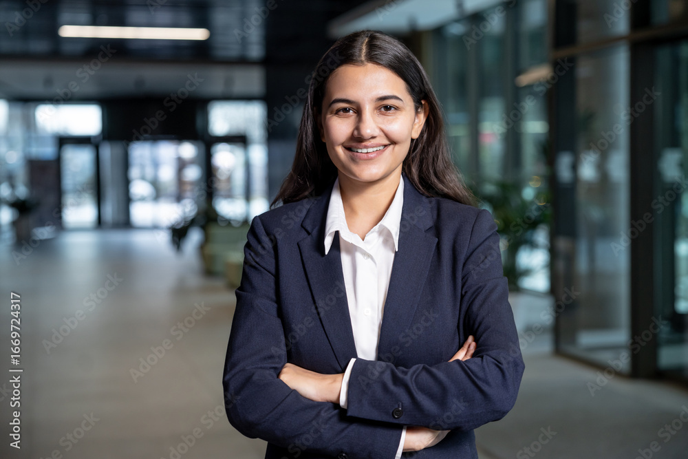 Cute young woman in jacket and white shirt standing with her arms crossed