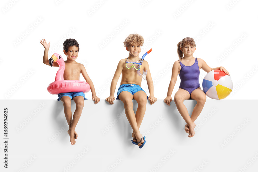 Two boys and a girl in swimming suits sitting on a blank panel with beach accessories