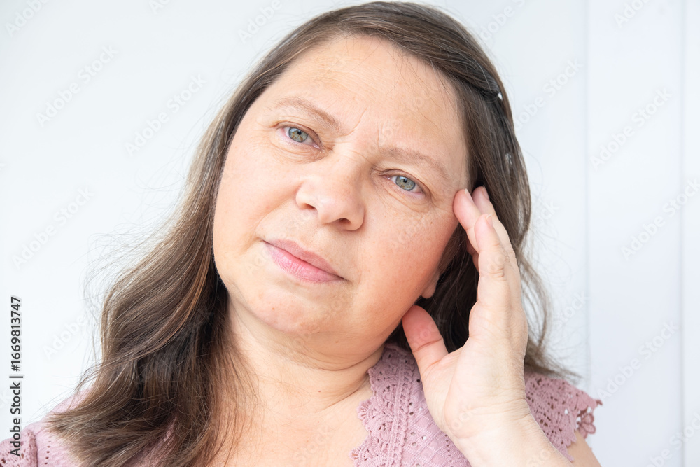Middle aged woman 50 years old, human ear ringing, listening, acoustics Auditory System, Hearing Test, Cochlear implant, Assistive listening device, healthy aging, quality mature life, health check