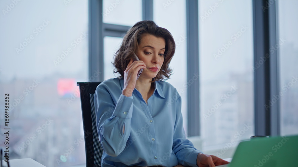 Annoyed businesswoman arguing cellphone worried document in office closeup.