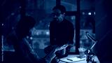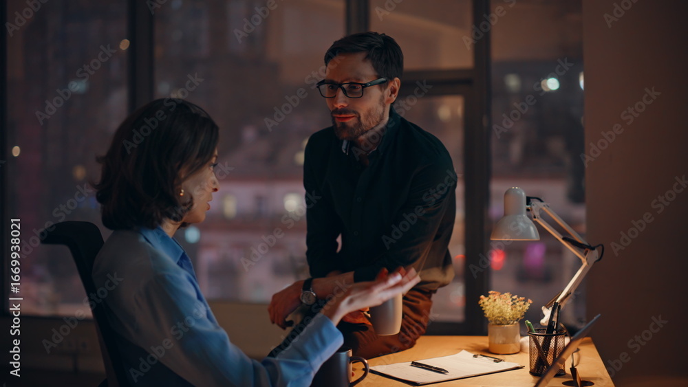 Relaxed staff talking friendly at dark company workplace with laptop closeup.
