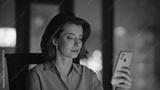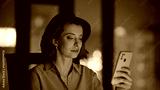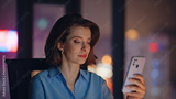Smiling businesswoman shopping mobile phone at night office closeup. Happy woman