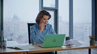 Smiling business lady calling cellphone checking papers at workplace closeup.