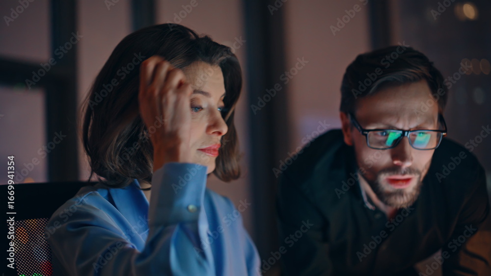 Closeup colleagues working late evening browsing laptop. Coworkers discussing