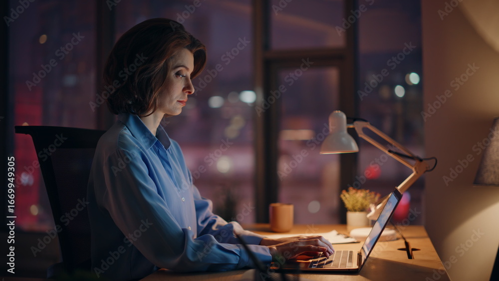 Late worker typing laptop in lamp light closeup. Serious businesswoman working