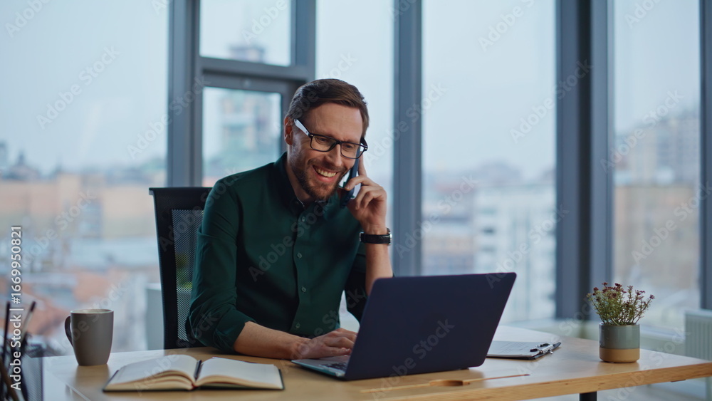 Friendly consultant calling smartphone entering laptop at workplace closeup.