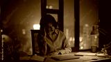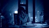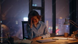 Tired executive sitting dark office by panoramic window with city lights closeup