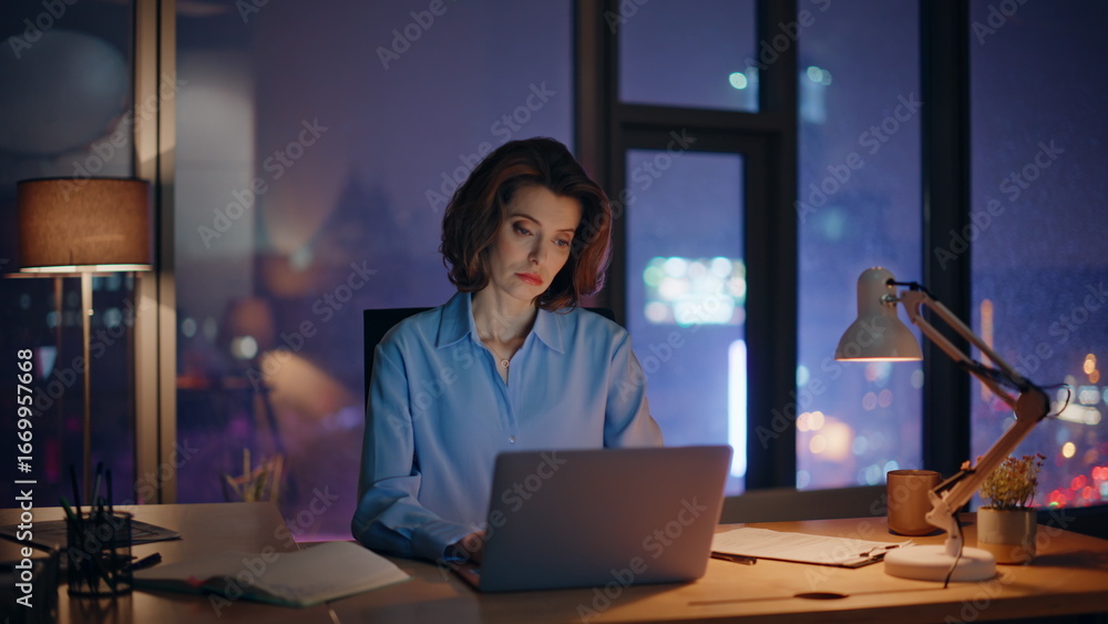 Overtime manager looking laptop unmotivated to late work in dark office closeup.