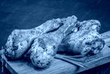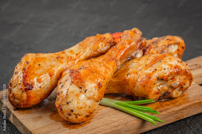 Juicy roasted chicken drumsticks with spices on wooden board. copy space