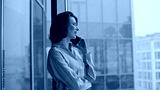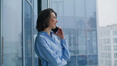 Smiling ceo talking mobile phone standing panoramic window closeup. Happy woman