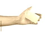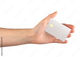 White textured bank card with chip in female hand. Minimalist debit or credit card isolated on white