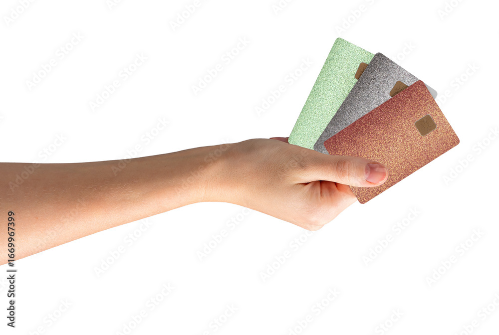 Female hand holding three bank cards with chip in glitter textures green, silver, and bronze.