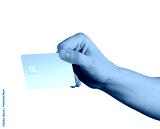 Male hand showing a silver metallic credit card with chip. Concept of secure transaction, modern