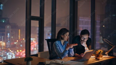 Tensed coworkers analyzing problem online project at night office. Two partners