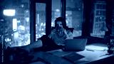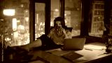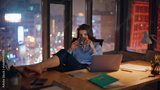 Calm businesswoman drinking coffee sitting night modern office. Elegant woman