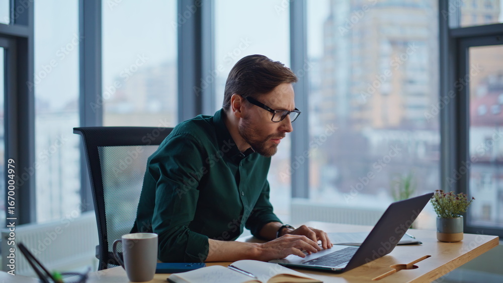 Overjoyed entrepreneur feeling success looking laptop at company office closeup.