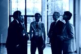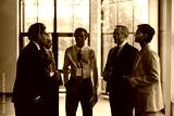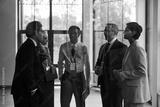Group of middle aged multiethnic business professionals standing in office discussing project, including Caucasian man, woman, Black man, wearing corporate badges
