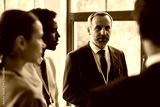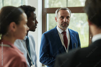 Middle aged Caucasian man in suit standing among diverse group of professionals, listening attentively during business meeting, facing camera with serious expression