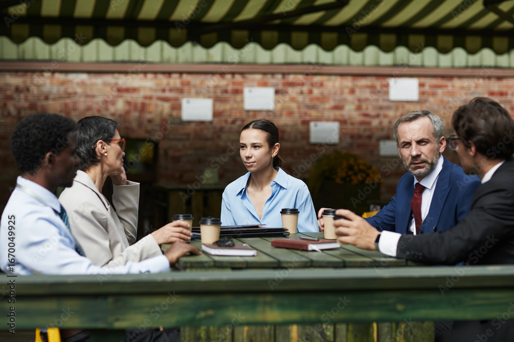 Group of middle aged and young multiethnic men and women sitting at outdoor table under canopy discussing business, holding coffee cups and digital devices, engaging in conversation