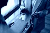 Middle aged Caucasian woman holding pen and gesturing while standing near window, interacting with middle aged man holding notebook, both engaged in business discussion indoors