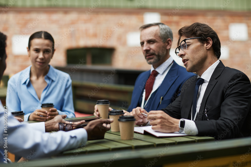 Diverse group of middle aged multiethnic business professionals discussing project outdoors, sitting at table with coffee cups, man in suit gesturing and speaking, woman and man listening attentively