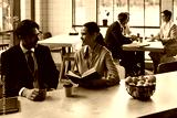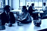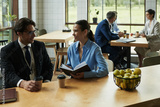 Caucasian young man and woman in business attire sitting at table holding coffee cups and book, talking in modern office cafeteria with two middle aged colleagues in background