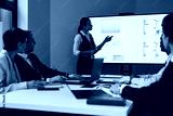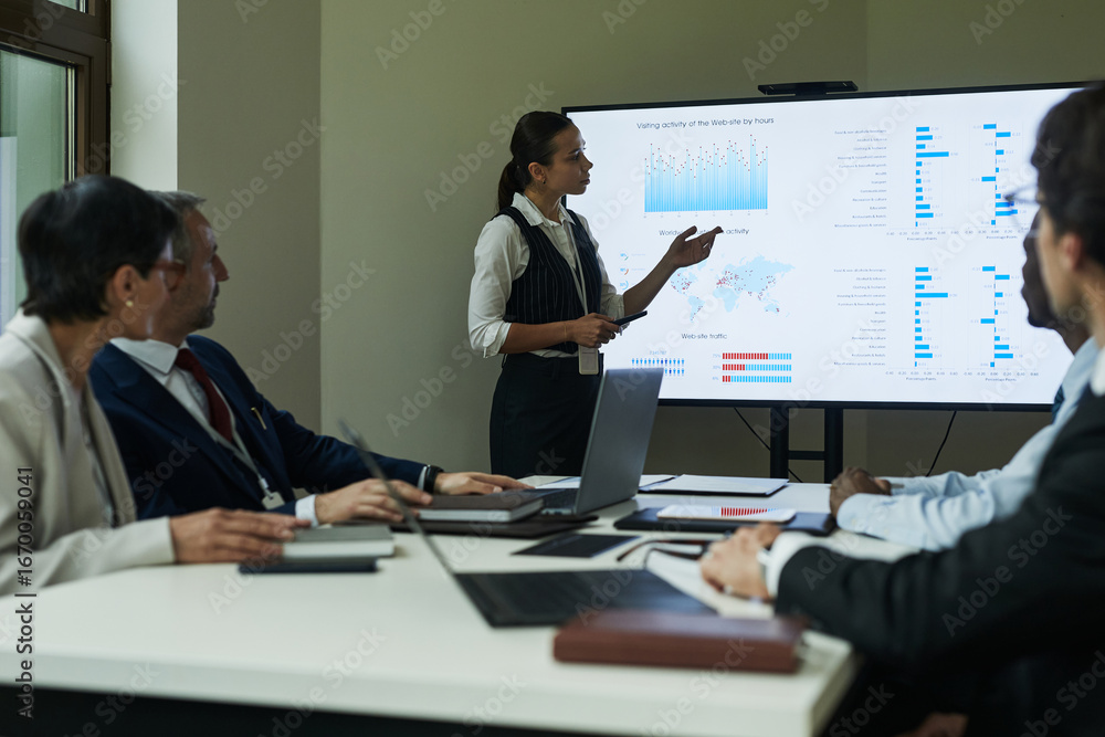 Young Caucasian woman presenting business analytics to group of middle aged men in conference room, standing near large screen displaying charts and graphs during meeting