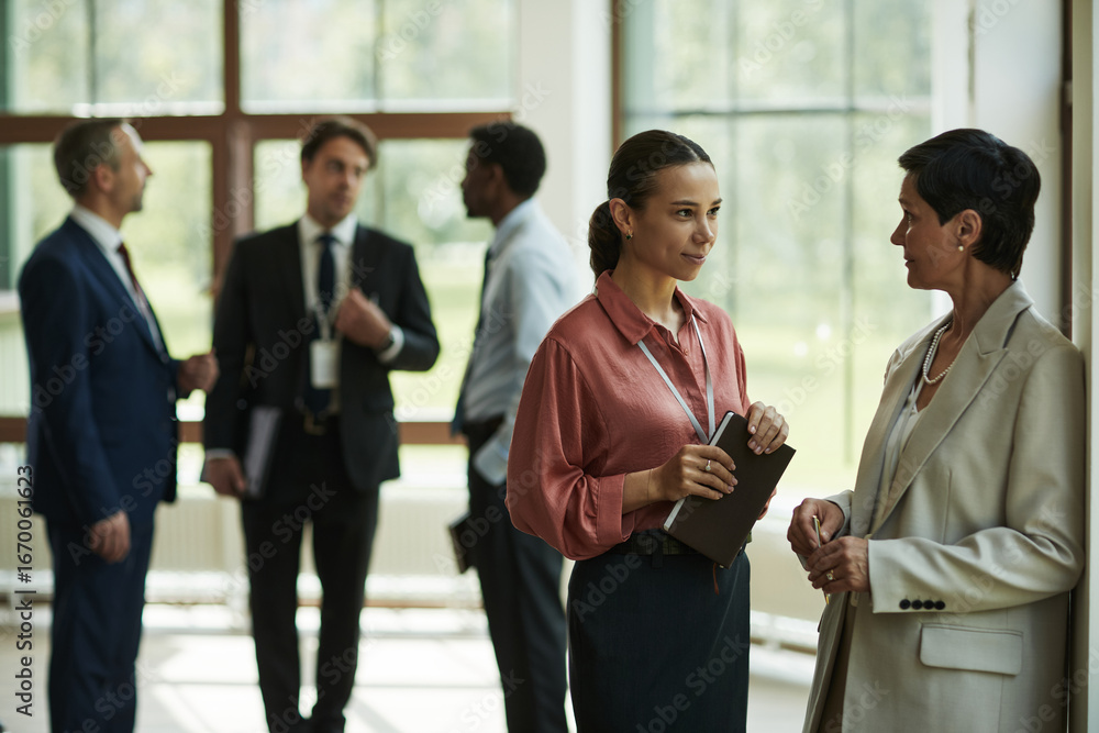 Two young and mature businesswomen, one Caucasian and one possibly Hispanic, standing and talking in office hallway while three middle aged businessmen and one Black man networking in background