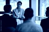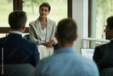 Middle aged Caucasian woman addressing group of young colleagues during business meeting, sitting in modern office, maintaining eye contact, engaging in professional discussion