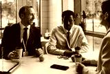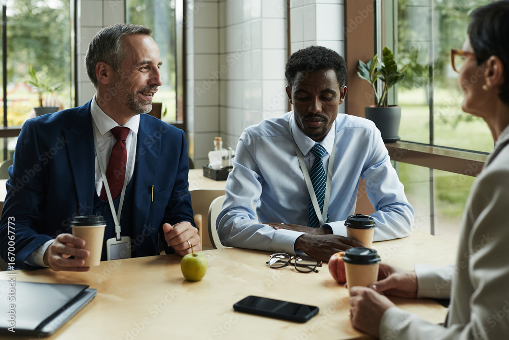Middle aged Caucasian, Black men, mature woman sitting at table holding coffee cups, corporate colleagues engaging in business meeting, smartphone and apples on table