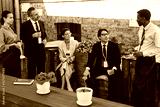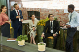 Group of middle aged and young multiethnic business professionals standing and sitting outdoors holding coffee cups and engaging in conversation during coffee break