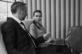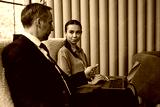 Caucasian middle aged man talking to young woman working on laptop, both sitting in modern office lounge, woman listening attentively while man gesturing with hand, discussing corporate project
