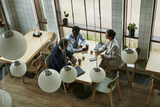 Group of middle aged multiethnic business professionals discussing project at table in modern office cafeteria, using laptops and smartphones, collaborating on work tasks together