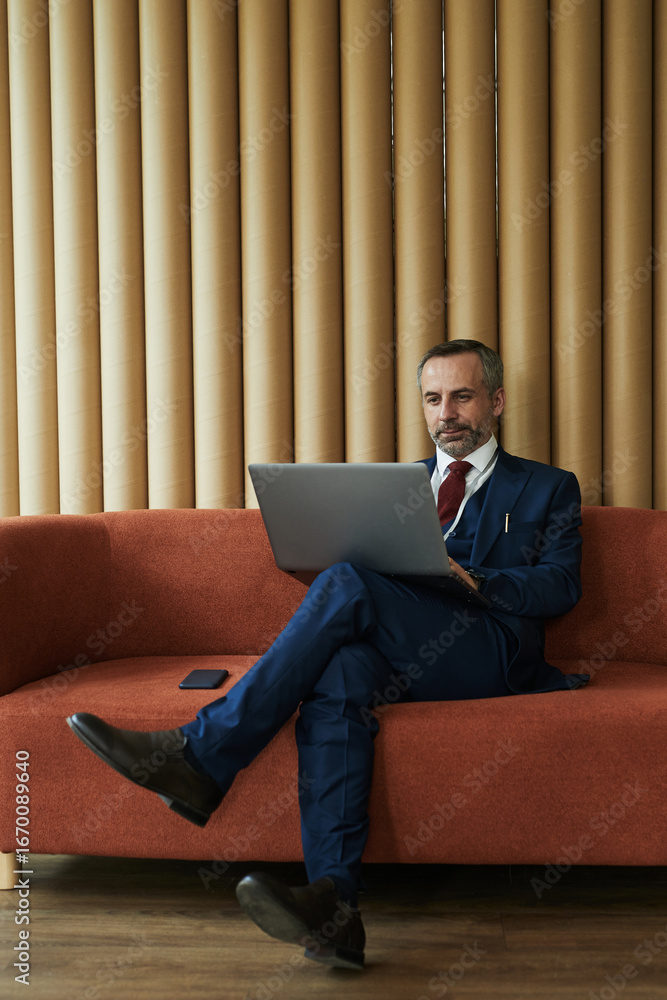 Middle aged Caucasian man sitting on sofa using laptop, crossing legs and focusing on screen, smartphone resting nearby, vertical decorations on wall in background