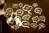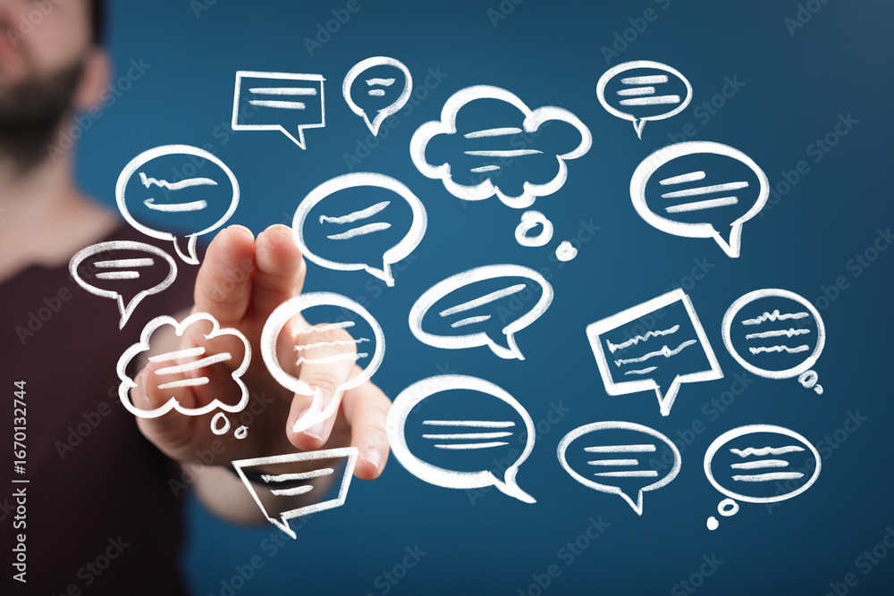 Hand interacting with digital speech bubbles,communication, conversation, social media concept.