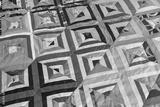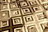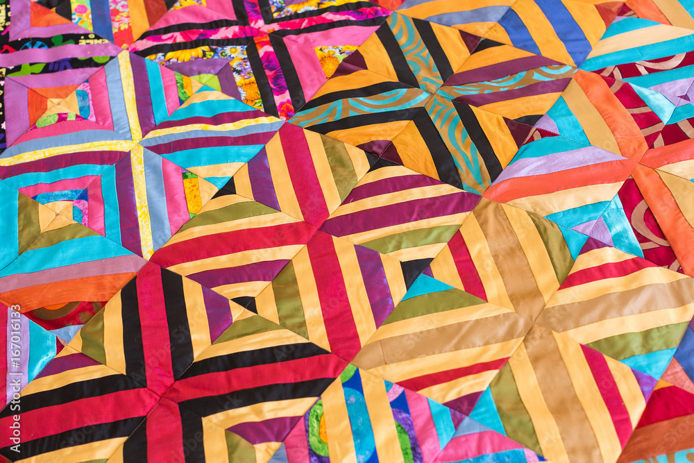 housekeeping, sewing, retro concept. a bright perfectly symmetrical and leveled pattern on the coverlet sewn at home from different fragments of fabrics captures the look